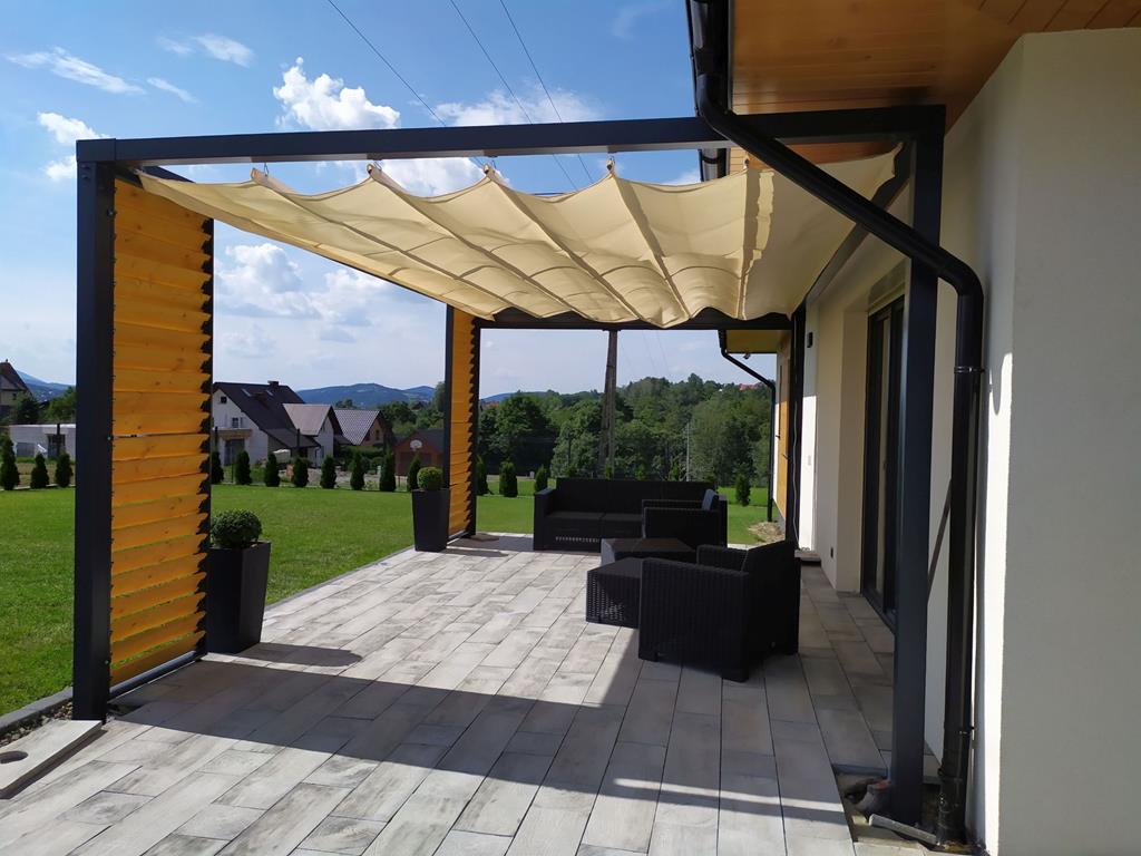 - Aluminiowe (z dachem lamelowym / z dachem z tkaniny)