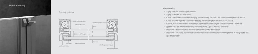 - Część stała dolna składa się z szyby laminowanej ESG-VSG66.2 warstwowej PN-EN14449