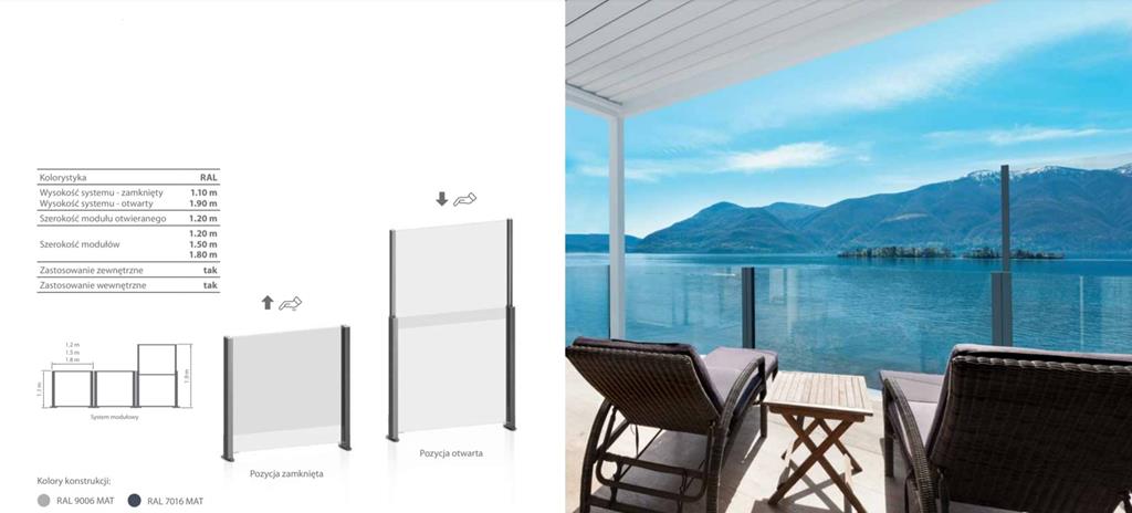 Szklane barierki wyposażone w bezpieczne szyby odporne na uderzenia. Część dolna stała to szyba laminowana. Część górna podnoszona to 2 warstwowa szyba hartowana. Możliwość rozbudowy i łączenia w linii prostej oraz pod kątem 90 stopni. Barierki mogą być wyposażone w moduł otwierany tzw. bramkę. Wysokość systemu złożonego 1100mm, a po wysunięciu drugiej szyby 1900mm. Całość konstrukcji nośnej wykonana z aluminium uzupełnionego elementami ze stali nierdzewnej.